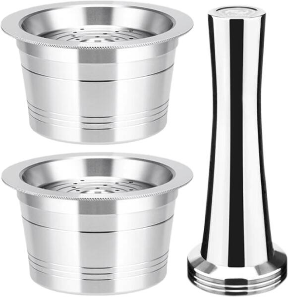 2 db prémium minőségű, hosszú élettartamú, őrölt kávéval tölthető rozsdamentes acél kapszula Tchibo Cafissimo típusú kávéfőzőhöz, tamperrel.